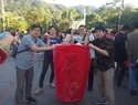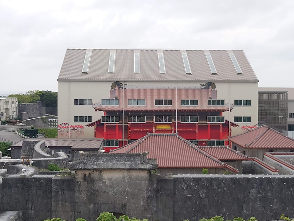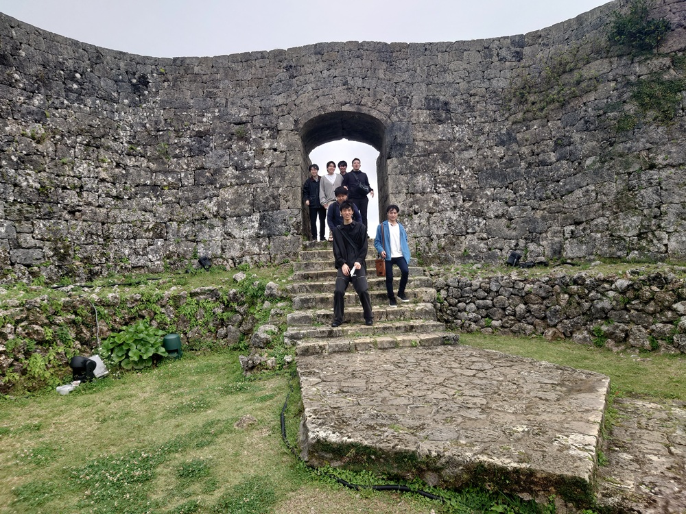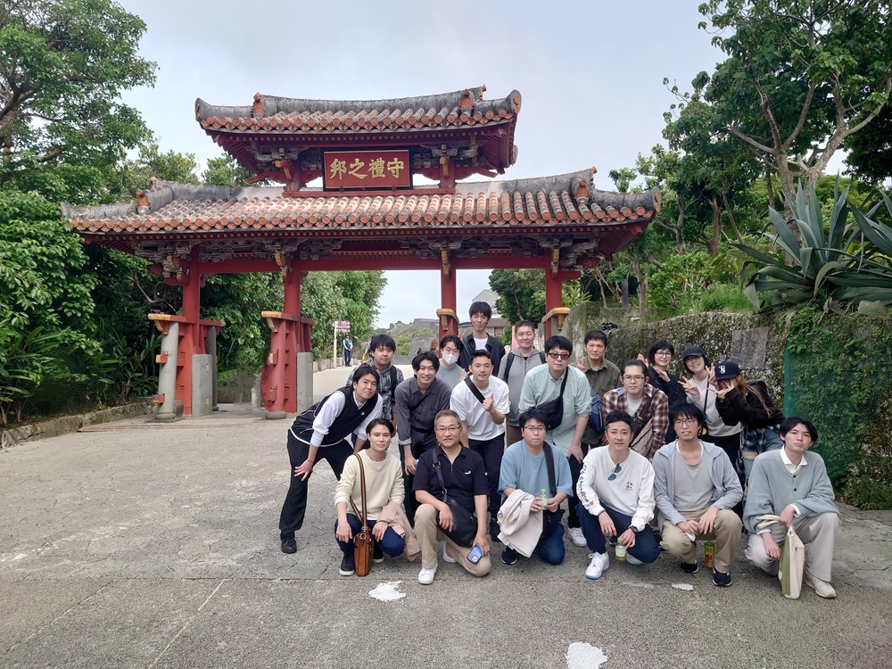 那覇空港に到着後、まずは首里城へ。現在再建中の首里城では、守礼門の前で全員集合写真を撮影。