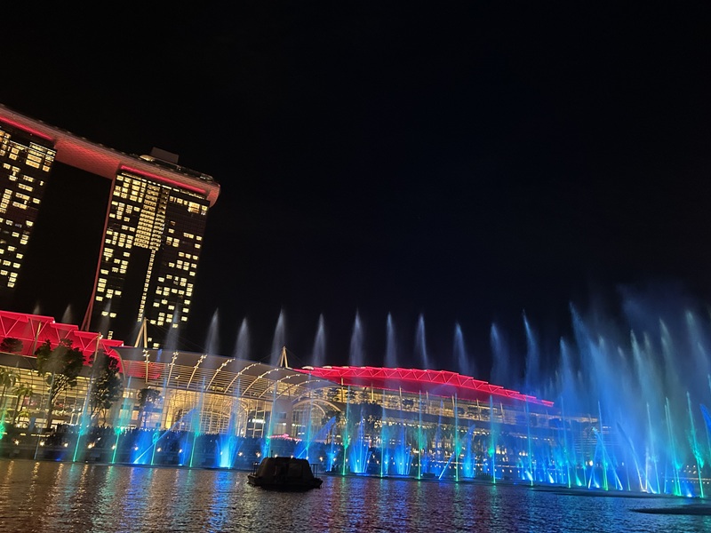 水上から臨むマリーナベイサンズ前の「スペクトラ」ショーは幻想的で忘れがたいひとときでした。