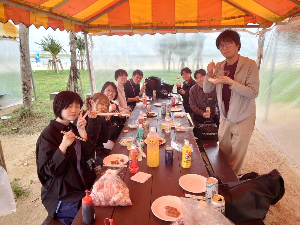 昼食はアメリカンビレッジのサンセットビーチでBBQ!青空の下、海を眺めながらの食事は格別。