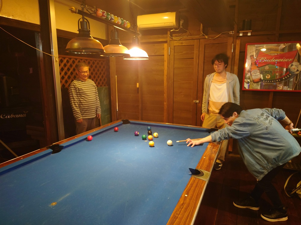 夜は「レクー沖縄北谷スパ&リゾート」でビリヤード対決。白熱した勝負に笑いが絶えませんでした。